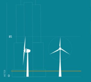 Mittlerweile sind neuere Windanlagen 250 m hoch und haben einen Rotordurchmesser von 175 m. Die noch in den 90er Jahren gebauten ersten Anlagen sind deutlich niedriger und haben nur eine Gesamthöhe von 85 m und einen Rotordurchmesser von 40 m.