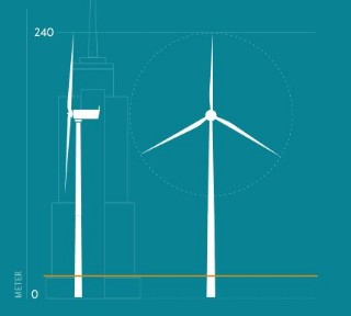 Mittlerweile sind neuere Windanlagen 250 m hoch und haben einen Rotordurchmesser von 175 m. Die noch in den 90er Jahren gebauten ersten Anlagen sind deutlich niedriger und haben nur eine Gesamthöhe von 85 m und einen Rotordurchmesser von 40 m.